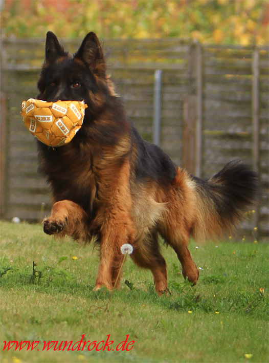 Ein großer, typvoller und kräftiger Rüde. Hoher Widerrist, sehr gute Vor– und Hinterhandwinkelungen, sehr guter Verlauf der Ober– und Unterlinie, sehr gute Lage und Länge der Kruppe. Feier Vortritt, sehr guter Nachschub, korrekte Gänge, sehr gute Haarlänge, sehr gutes Pigment.